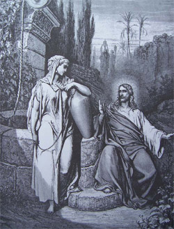 Une femme de Samarie vient pour puiser de l'eau. Jésus lui dit : "Donne-moi à boire." La femme samaritaine lui dit : "Comment ! toi qui es Juif, tu me demandes à boire à moi qui suis une femme samaritaine ?" (Les Juifs en effet n'ont pas de relations avec les Samaritains.) Jésus lui répondit : "Si tu savais le don de Dieu et qui est celui qui te dit : Donne-moi à boire, c'est toi qui l'aurais prié et il t'aurait donné de l'eau vive." Elle lui dit : "Seigneur, tu n'as rien pour puiser, et le puits est profond. D'où l'as-tu donc, l'eau vive ? Serais-tu plus grand que notre père Jacob, qui nous a donné ce puits et y a bu lui-même, ainsi que ses fils et ses bêtes ?"