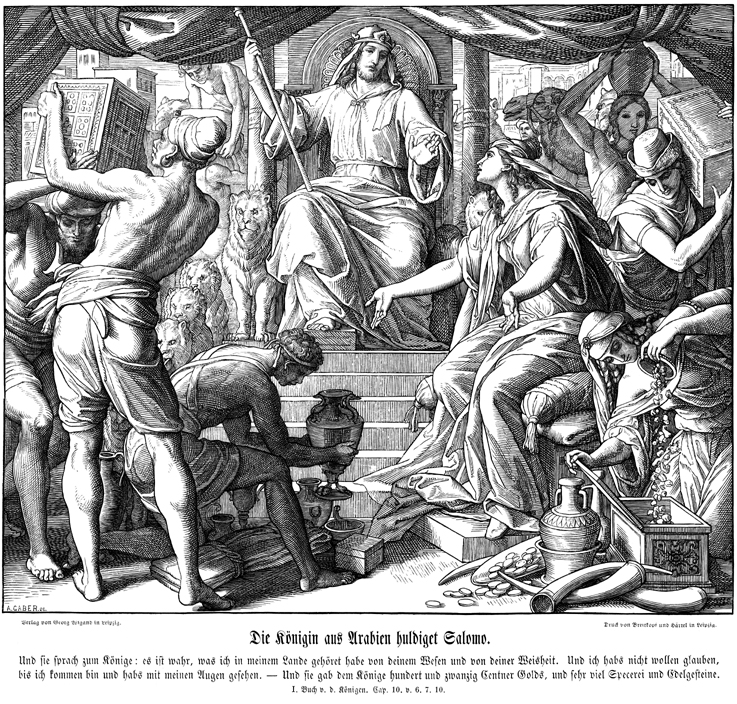 L’épisode de la reine de Saba se situe au 10ème s. av JC, le règne de Salomon est une période de paix et le roi noue des relations avec ses voisins, dont le Yémen du Nord d’où vient la riche caravane de la reine