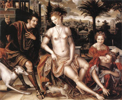 Le bain de Diane-Artémis est aussi un thème classique. La chaste déesse se baigne quand elle est surprise par le chasseur Actéon, qu'elle fait dévorer par ses chiens |