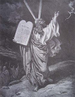 Dieu a donné à Moïse, Sa Loi gravée sur des Tables de pierre. Selon le récit biblique Il les lui donne deux fois. La première fois Moïse les brise de colère en voyant le peuple adorer une idole, le Veau d'or. La seconde fois Moïse descend de la montagne et les présente solennellement au peuple pour qu'il les garde. Moïse est un homme âgé et barbu. De son visage rayonnent deux faisceaux lumineux alors qu'il porte le plus souvent des cornes d’or ou de lumière. Cela est dû à une erreur de traduction, l'hébreu rayons lumineux est devenu cornes d’or en latin. D’où un Moise "biscornu", et qui le restera longtemps, surtout dans la sculpture, où les cornes sont plus faciles à représenter que les rayons.