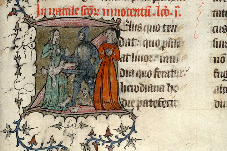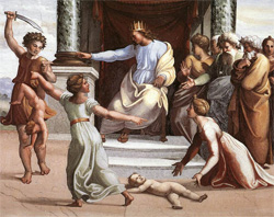 Le roi Hérode furieux de ne pouvoir tuer l’enfant Jésus que les mages lui ont annoncé comme le futur roi des Juifs, fait massacrer tous les bébés de Bethléem.
