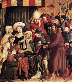 Jésus fut amené en présence du gouverneur et le gouverneur l'interrogea en disant : "Tu es le Roi des Juifs ?" Jésus répliqua : "Tu le dis." Puis il garde le silence tandis que la femme de Pilate demande à son mari : "Ne te mêle point de l'affaire de ce juste ; car aujourd'hui j'ai été très affectée dans un songe à cause de lui