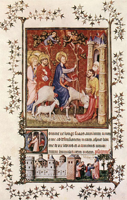 L'entrée de Jésus à Jérusalem; vers 1409 enluminure sur parchemin des Très Belles Heures du Duc de Berry;  Museo Civico d'Arte Antica, Palazzo Madama, Turin