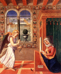 Annonciation avec St Emidius; CRIVELLI, Carlo; 1486 huile et tempera sur bois transféré sur toile; National Gallery, Londres |