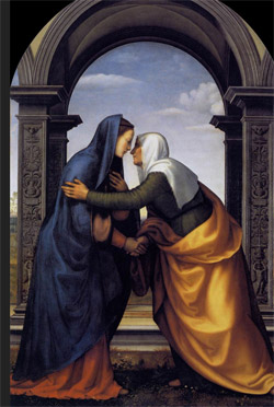 Marie enceinte de Jésus rend visite à sa cousine Elisabeth qui attend elle-même Jean Baptiste.