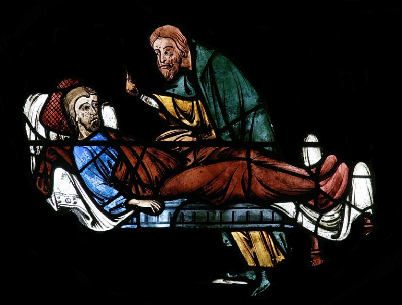 Le bon Samaritain; ; XIIIème s. vitrail, cathédrale de Sens